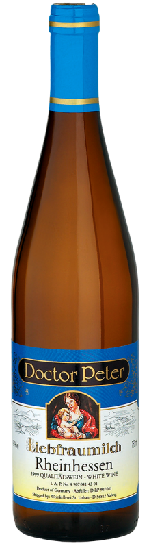 Region Hesji Reńskiej - Niemcy, reńskie klasyczne, jakościowe białe wino półsłodkie. Historycznie wino to pochodzi z winnic okalających kościół Najświętszej Marii Panny w miejscowości Warms. Jednakże niemieckie prawo winiarskie, uznaje również za wino Liebfraumilch wysokogatunkowe wino z regionów: Rheinhessen, Reinpfalz, Nahe lub Rheingau. Liebfraumilch to klasyczne, wysokojakościowe wino niemieckie powstałe z połączenia dwóch typowych dla tego regionu rodzajów wina: Silvaner i Műller-Thurgau. Winogrona, z których wyrabia się ów szlachetny trunek, poddawane są rygorystycznej selekcji, a samo już wino wnikliwie testom smakowym. Doctor Peter odznacza się silnym, wyrazistym charakterem, o świeżym pełnym bukiecie i powabnym, delikatnym smaku. Można je łączyć z każdą wykwintną potrawą lub spożywać jako aperitif. Podawać w temp. 12°C